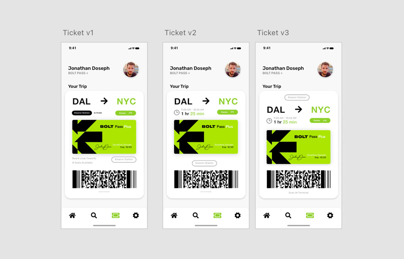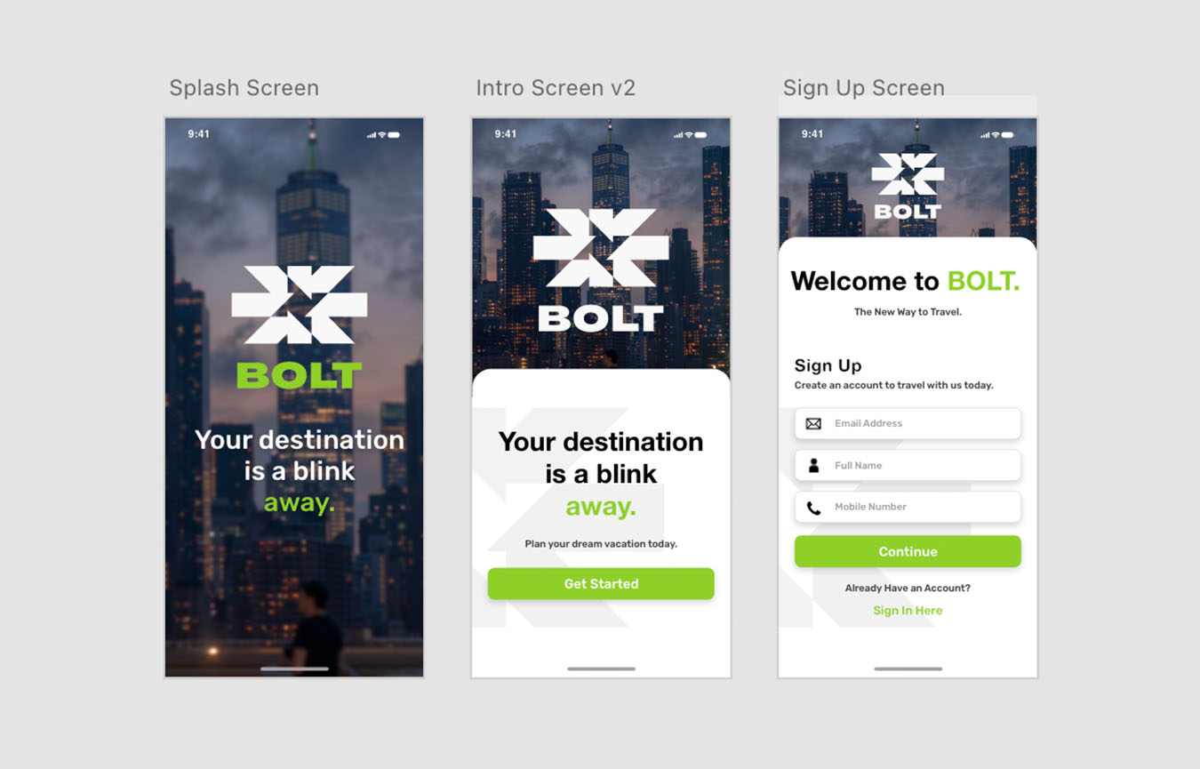 We wanted to make our app as simple to use as possible and these key points ensured that we would focus on our main goal: to get people to travel with us. First, we focused on presenting the user with popular destinations with travel times. Showing a comparison in travel times would convince users that BOLT was the way to go in terms of travel time. In a hyperloop system, travel times could be shortened but as much as half in comparison to traditional airplanes which we wanted to show the users. Second, we wanted to make the ticketing process as easy as possible to obtain and use in terms of boarding. Mobile ticketing is the new standard for travel, and we wanted to experience to be seamless whether you were using a computer or a mobile phone.